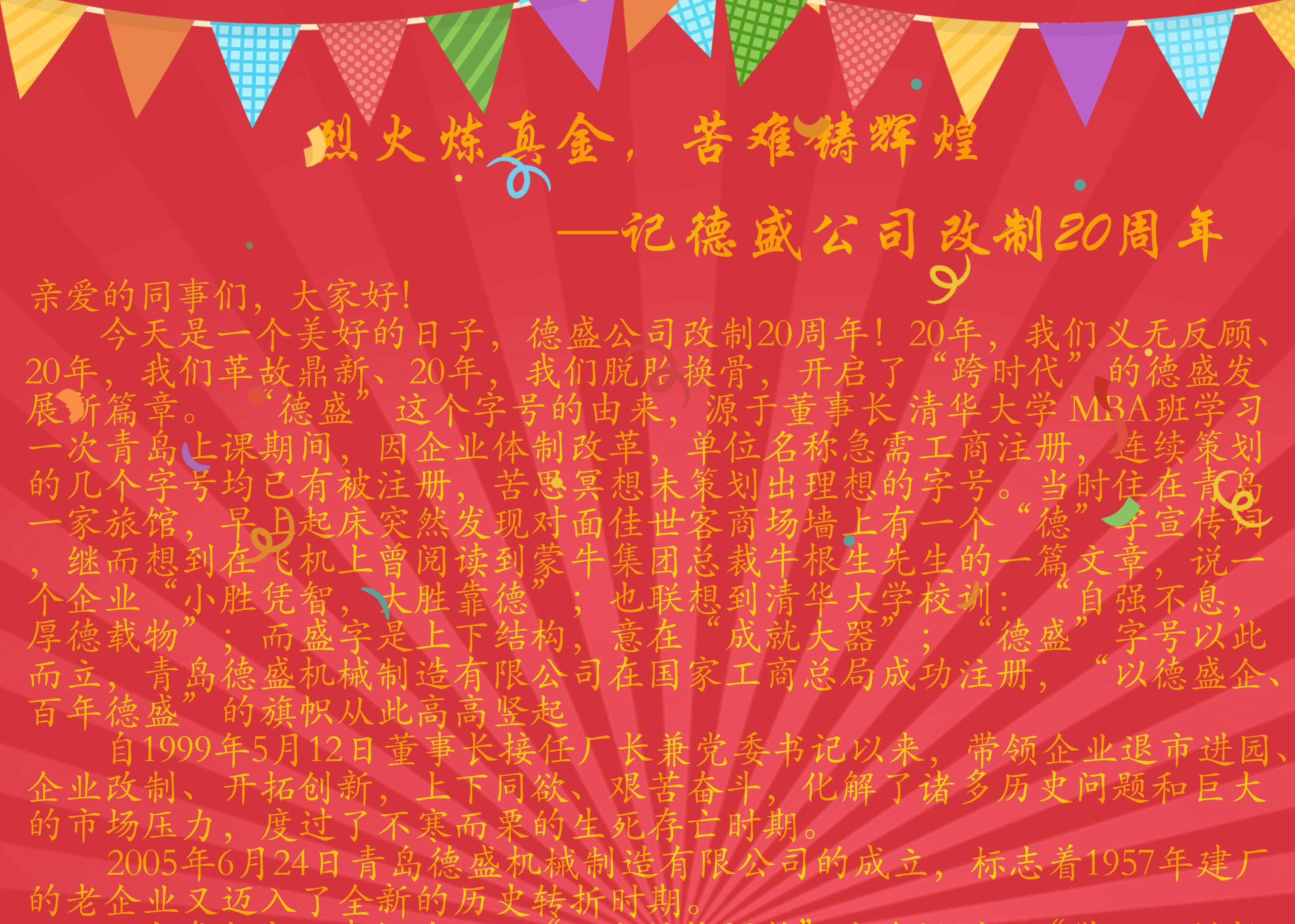 熱烈慶祝青島德盛機械制造有限公司改制20周年!